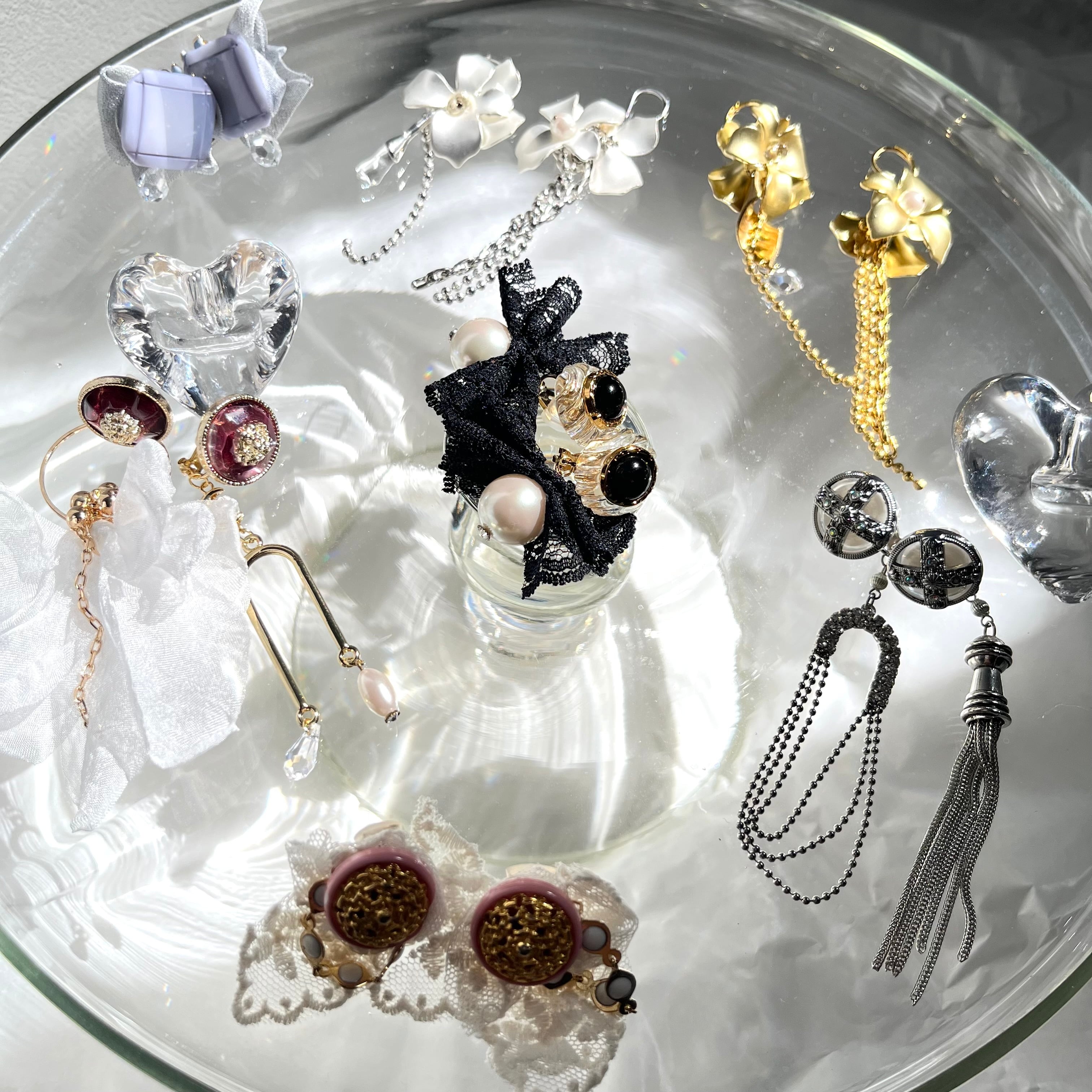 金属アレルギーの方には pierce→チタン、樹脂ピアス earrings→316L(サージカルステンレス)、樹脂ノンホールピアス 交換可能です。 ブローチの変更も承ります。