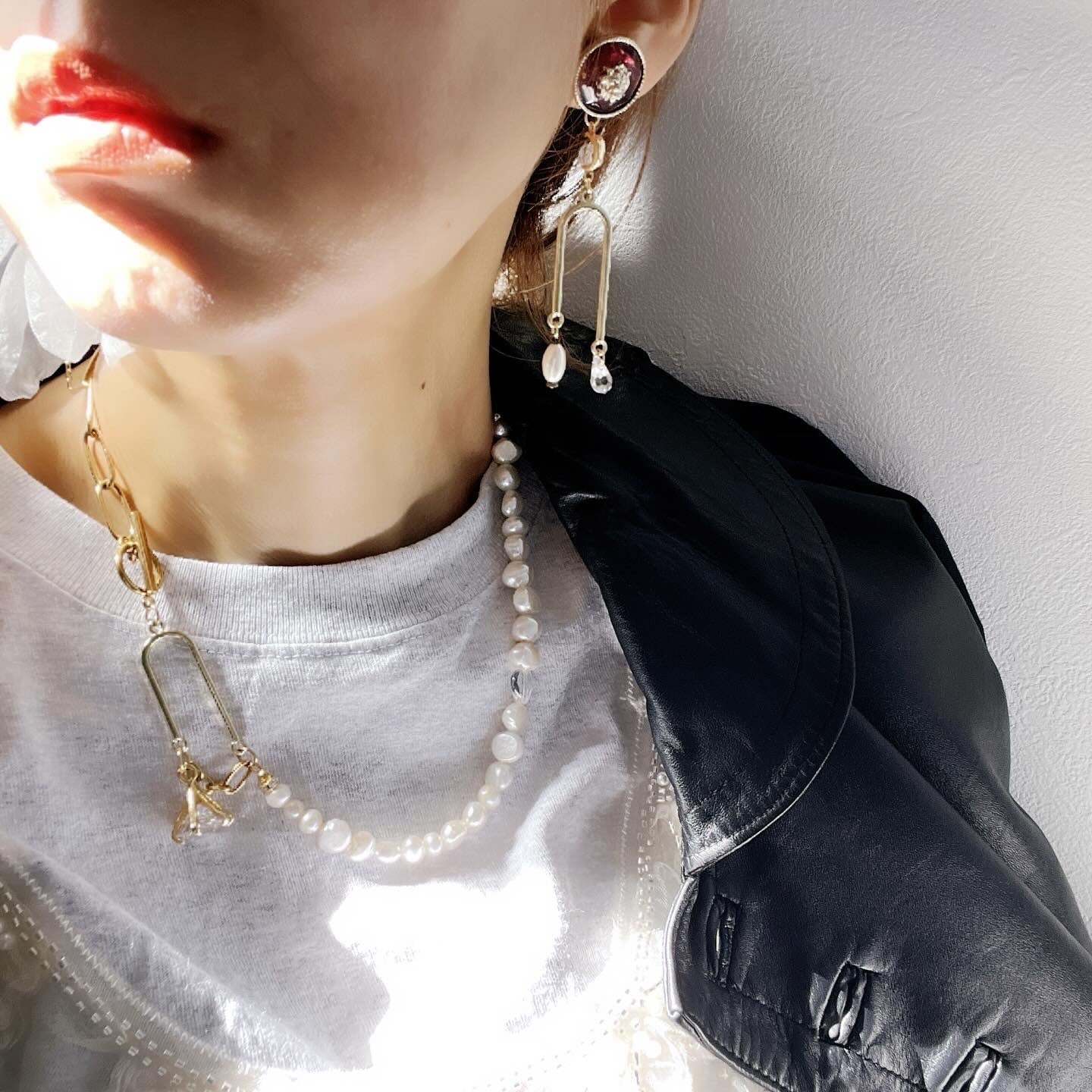今秋冬イチオシのパールとチェーンのミックスピアス。 チェーンとチェーン、チェーンとパールを絡ませた独特なデザインが特徴的。 ハードな要素に上品さをプラスしたピアスは耳元を華やかに魅せます。 パーティーや普段のスタイルに、幅広いシーンでご使用いただけるピアスです。 チェーン/ピアスフープ:316Lサージカルステンレス 淡水パール 長さ:5cm 左右アシンメトリー