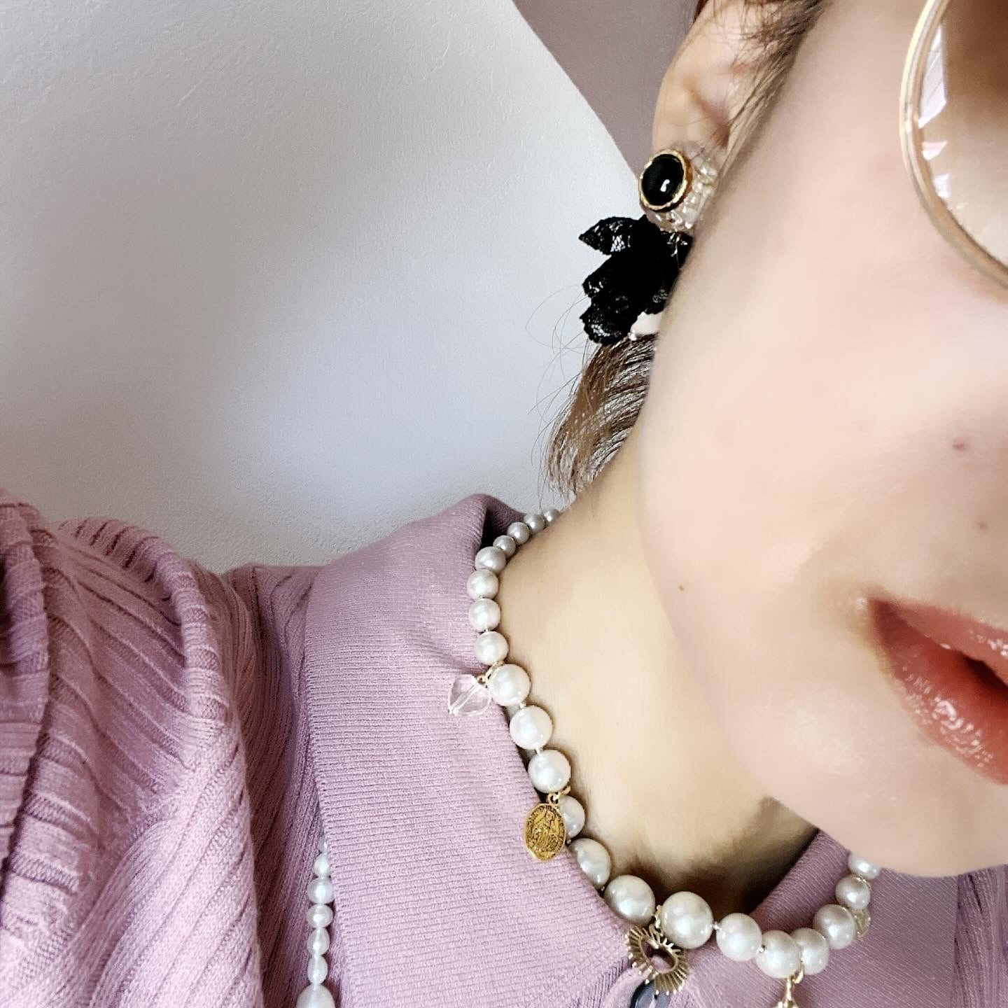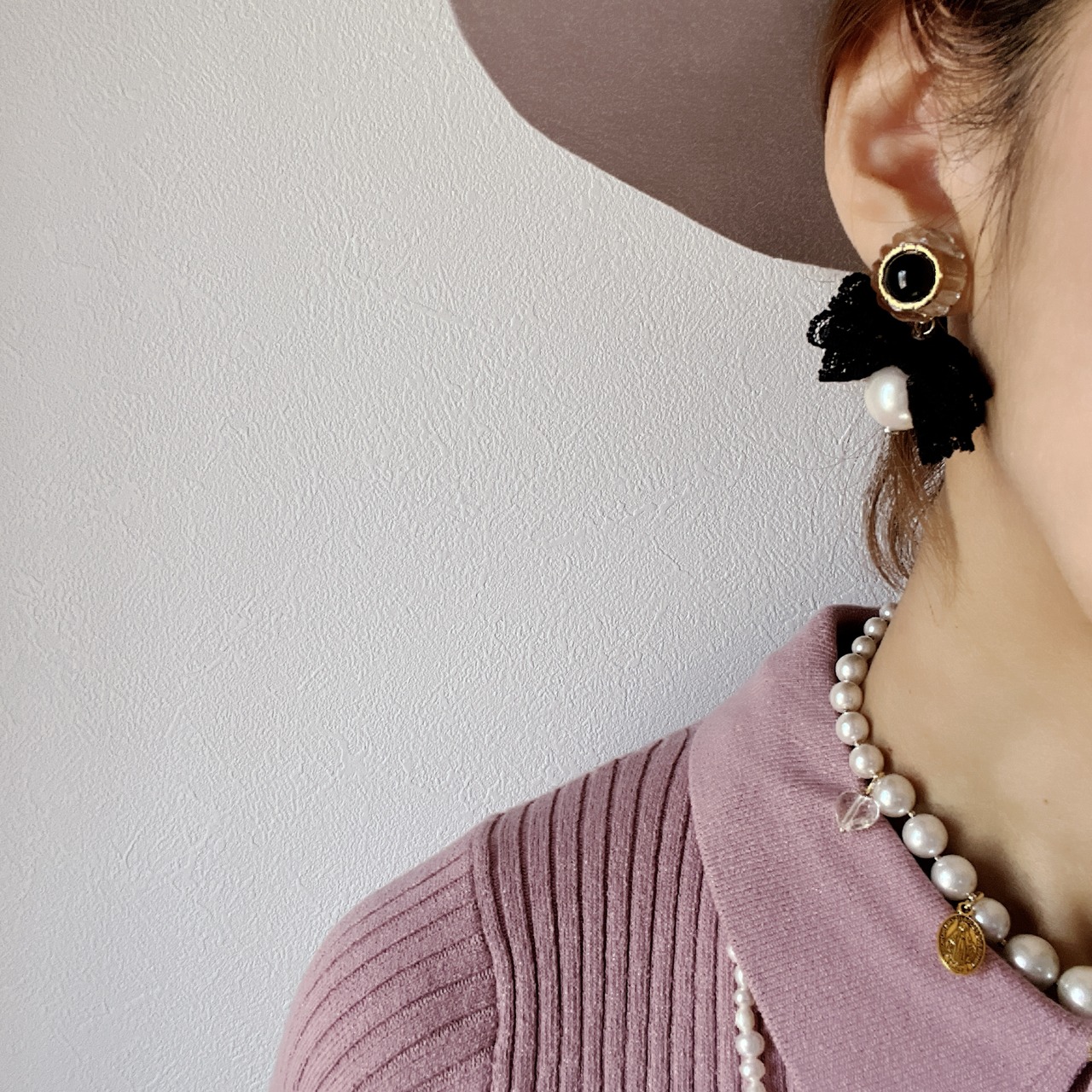 ガーリーだけどブラックで甘さを控えた、大人可愛いテイストの耳飾りです。