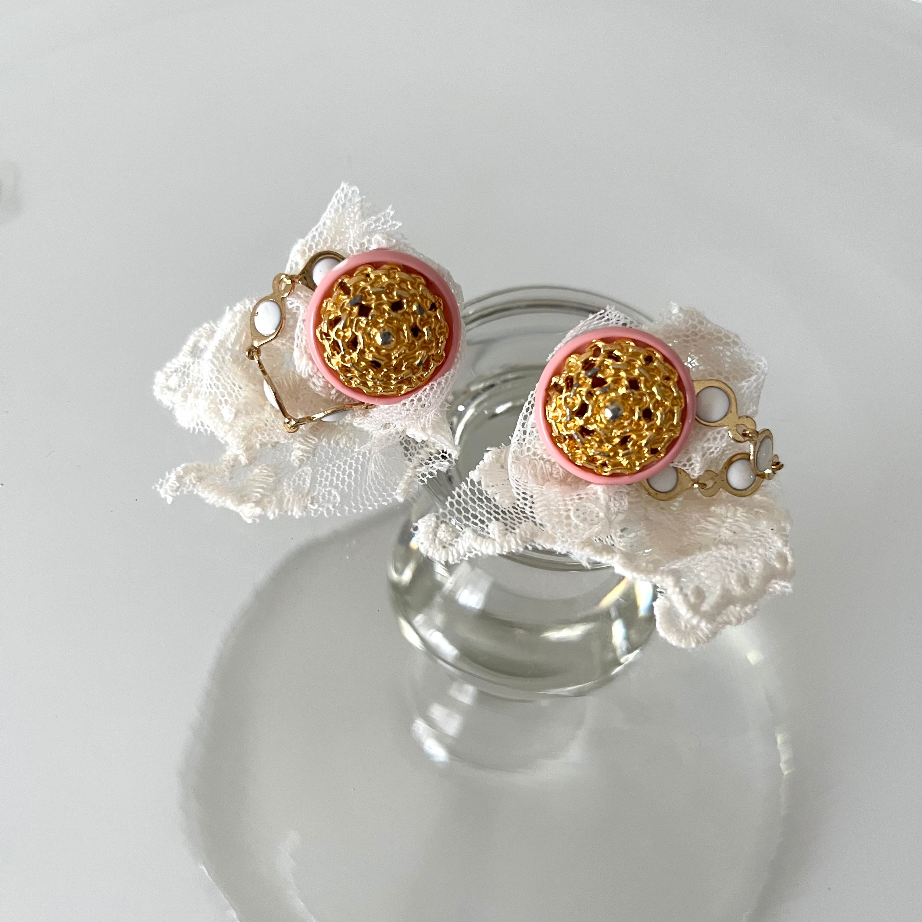 ピンクに透かしゴールドが可愛いヴィンテージボタンにレースを加えた甘めテイストな新作イヤリング。