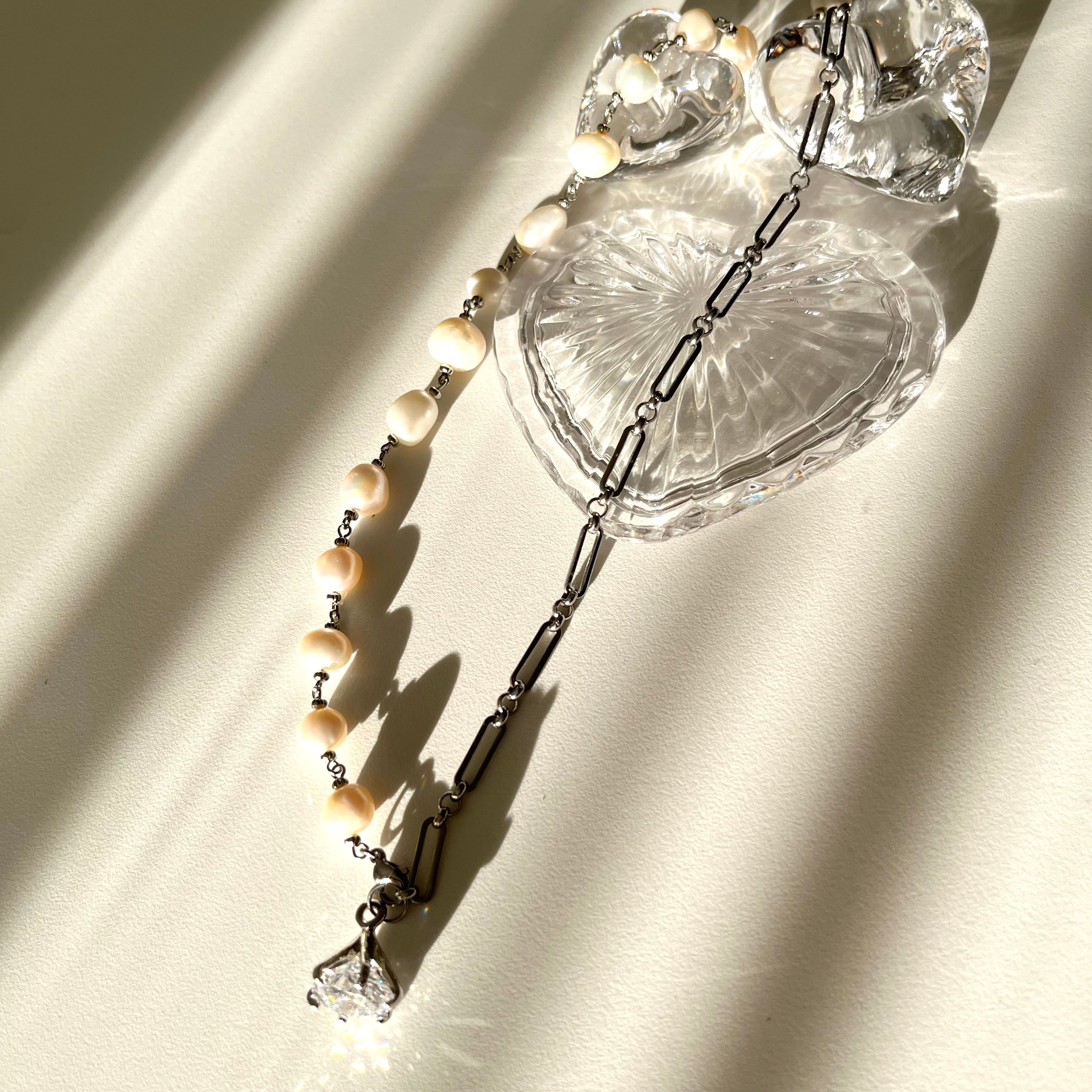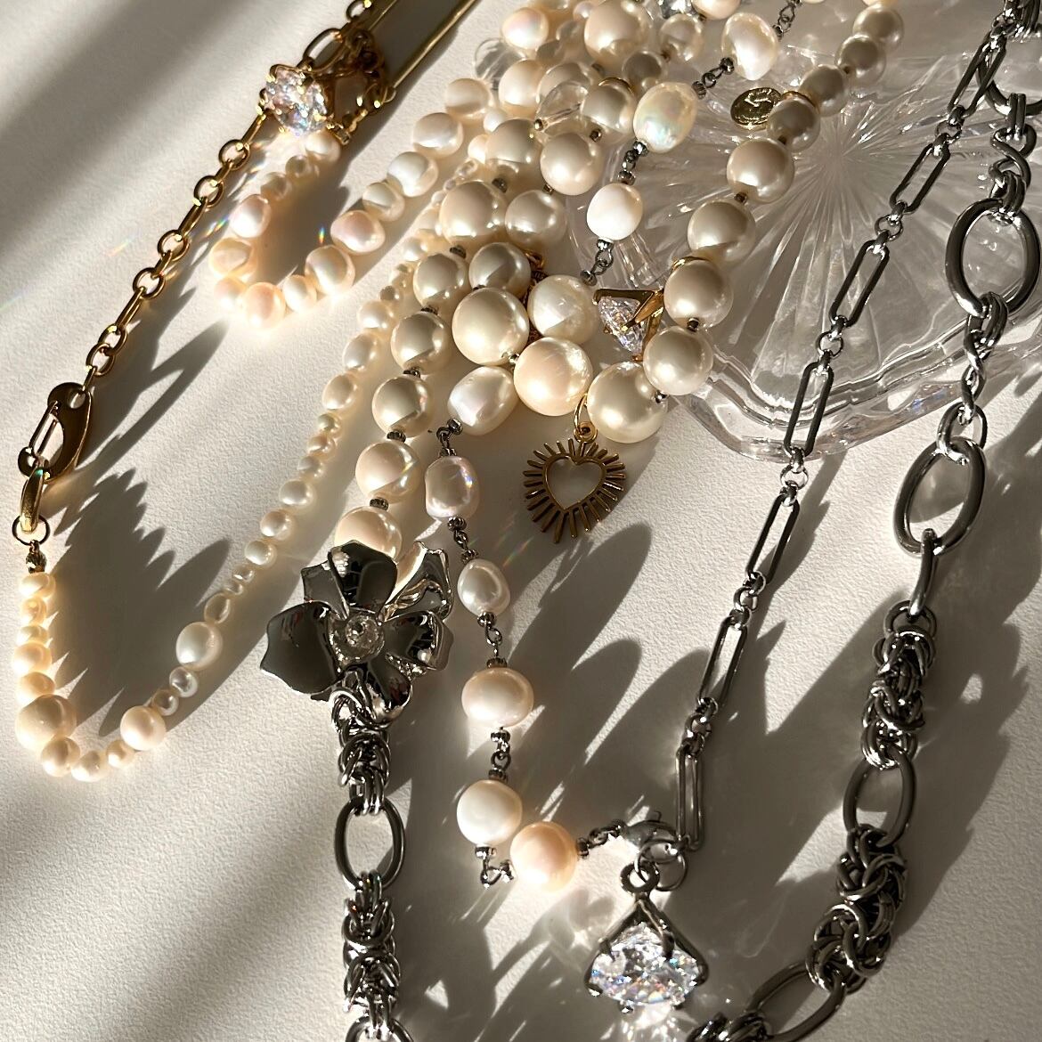 パールとシルバーチェーンのコンビが絶妙な、新作のパールチェーンネックレス。